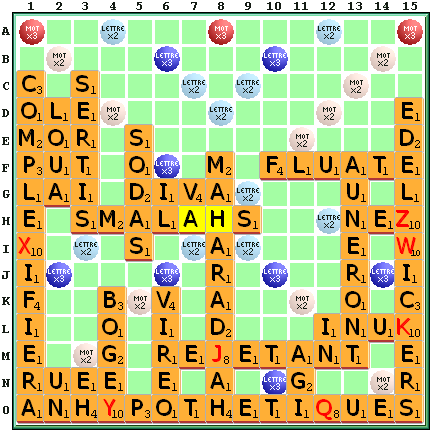 -- Déroulement de la partie --# Tirages Pos Pts Tot Mots retenus 1.??ALMSS H3 66 66 SMALAHS 2.EIIIRST 3C 14 80 SERTIS 3./AGLLLOU 2D 16 96 LOUA 4./MMOOOOO 1D 12 108 OM 5./ELOOOOQ 1G 9 117 LE 6./AAAADIV G5 26 143 DIVA 7./OOOOQSS 5E 12 155 SODAS 8./AAADJMR 8F 69 224 MAHARADJA 9.EEEEEQT M7 13 237 ÉJET 10./EIIIIRV 6K 21 258 VIRE 11./GIOPQTW O5 13 271 POT 12./AGIIIIQ 11M 17 288 AGI 13./AEEEENT M6 30 318 REJETANT 14./AENNORU 13F 60 378 AUNERONT 15.EGNNQTU O10 20 398 TIQUE 16./BDFLLTU F10 18 416 FLUÂT 17./DEEEEEE O9 13 429 ÉTIQUE 18.DEEEEE+E 15E 12 441 DE 19./CEFIIPX 1C 84 525 COMPLEXIFIE 20.EEEEERU N1 37 562 RUÉE 21./BBCGIKU L12 50 612 INUK 22.BBCG+ELZ H13 36 648 NEZ 23./CEEILRW 15D 92 740 EDELZWICKER 24.BGHHNNO 4K 14 754 BOGE 25.HHNN+ASY O1 1636 2390 ANHYPOTHÉTIQUES Jetons restants : BNN -- Palmarès -- Télécharger le fichier source |