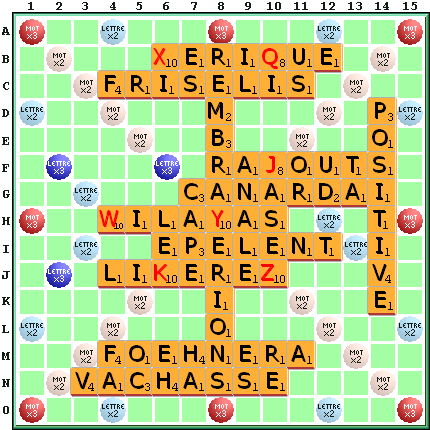 | Les 43 mots joués durant cette partie sont : ANA ANAL ANALE AS AY ÇÀ ÇA CANARDA CANARDAI CAP CAPE CAPÉ EH EMBRAYERIONS ÉPÈLENT ES ÈS FA FŒHNERA FRISELIS HA IL JAS JASE JASÉ JASEZ LE LÉ LEK LIKEREZ NA OC OR POSITIVE POSITIVÉ QI RAJOUTS RAY RAYE RAYÉ RAYER RÉ REMBRAYERIONS TA UD US VACHASSE WILAYAS XÉRIQUE XI |
