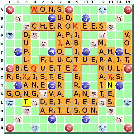 | Les 60 mots joués durant cette partie sont : AH AN ÂNE API ARTISON AY AYS BÊ BÉQUETE BÉQUETÉ BÉQUETEZ CE CHEROKEES DA DÉIFIÉE DOP DOPA DUPLEXANT EN ET EX FI FLUCTUE FLUCTUÉ FLUCTUER FLUCTUERA FLUCTUERAI FLUCTUERAIT FUS FUSE FUSÉ GONG HAÜYNES ILS IN JAB KIBITZER KIBITZERA KIBITZERAI KIBITZERAIS LET MARNAIT NE NÉ NÉO NU NUL QI QIN QING REXISTE SURAJOUTER SURAJOUTERA SURAJOUTERAI SURAJOUTERAIT TE TÉ UD US UTE VA VÉ VER VOLT WONS |