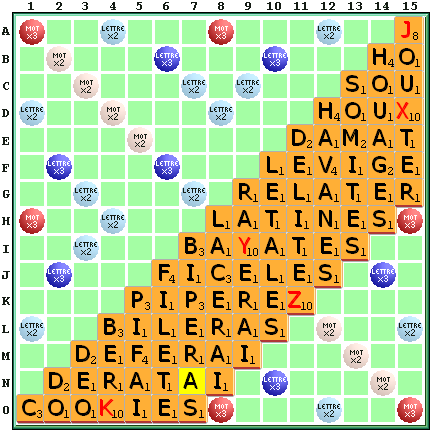 | Les 78 mots joués durant cette partie sont : AN ÂNE ÂNES BAYÂTES BÊ BER BERK BI BILERAS BIP BIPE BIPÉ BIPER BIPERA BIPERAS COOKIES DA DAM DAMA DAMÂT DE DÉ DÉFERAI DÉFÉRAI DÉLITEZ DÉO DÉRATAI DO ES ÈS ET ÊTA ÉTAL ÉTALE ÉTALÉ FI FICELÉS FICÈLES FIL FILE FILÉ FILET FILETÉ FILÈTE HAVANES HO HOU HOUA HOUAGES HOUX JOUXTER LA LÀ LAC LACE LACÉ LACER LACERA LACÉRA LACERAI LACÉRAI LATINES LE LÉ LÉTALE LÉTALES LEV LÉVIGE LÉVIGÉ LI LIT LITE LITÉ LITEZ OM OMÎTES OU OÙ PI PIF PIFA PIFAI PIPEREZ RA RAY RAYE RAYÉ RAYER RAYERA RAYERAI RELATER SOMITES SOU TE TÉ TES TÉS |